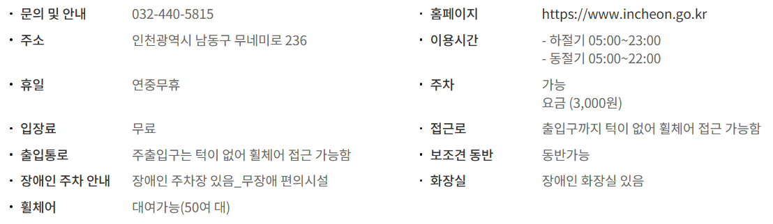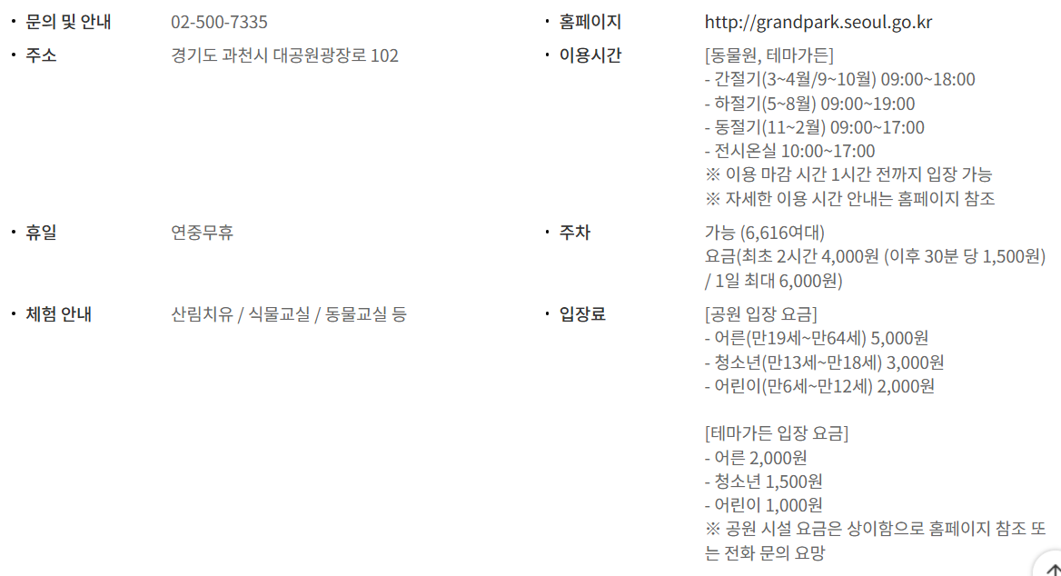이용시간 : ※ 시즌 별로 운영 시간이 상이하므로 자세한 사항은 홈페이지 참조 주차 : 가능입장료 :