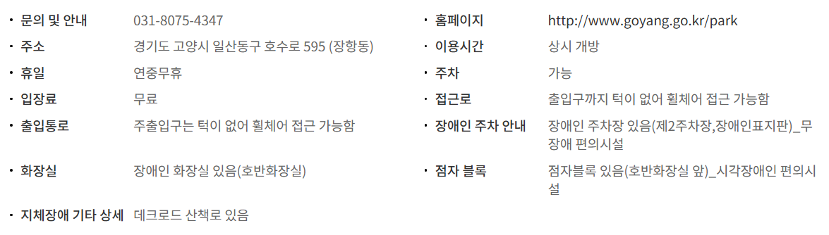일산호수공원은 일산신도시 택지개발사업과 연계하여 조성한 근린공원으로서 국내 최대의 인공호수를 만들어 도시인이 접할 수 없는 자연생태계를 재현하고 다양한 주변경관 및 호수를 이용한 레크레이션 공간을 제공하고 있다. 특히 호수를 중심으로 한 4.7km의 자전거도로와 메타세콰이어길 등 9.1km의 산책로는 시민들이 특별히 좋아하는 장소이며, 그 밖에 생태자연학습장, 조형예술품, 선인장전시관 등이 다양한 생태문화시설이 조성되어 있다. 또한 매년 고양국제꽃박람회, 가을꽃축제, 호수예술축제 등이 개최되는 등 국내는 물론 세계적인 명소로 자리잡아 가고 있는 공원이다.