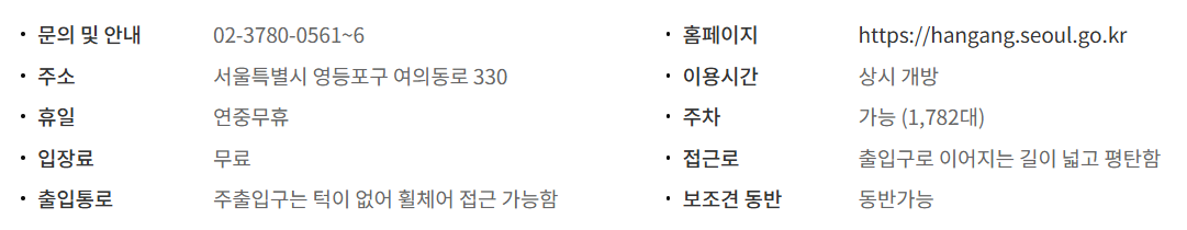 여의도한강공원은 정치, 금융, 언론의 중심지인 여의도에 자리하고 있으며, 지하철, 버스 등 대중교통으로 접근성이 좋아 직장인과 일반시민들이 즐겨 찾는 명소이다. 특히, 여의도 한강공원에서는 봄에는 벚꽃축제가, 가을에는 세계불꽃축제 및 각종 공연과 마라톤행사 등 다양한 행사가 이어져 볼거리와 즐길거리가 풍부한 휴식공간이다. 또한, 밤섬, 여의도 샛강 등이 비교적 자연 그대로 보존되어 있어 생태학습장 및 자연친화형 공원으로 조성되어 있다. 뿐만 아니라 한강르네상스 특화사업으로 물빛광장, 수상무대 및 수상분수, 빛의 폭포, 피아노물길, 페스티벌랜드, 요트마리나 등의 시설물들이 새로 조성되어 시민들에게 더 많은 사랑을 받고 있다.