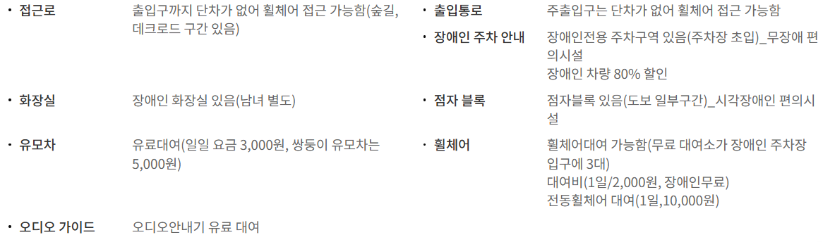 화장실 : 장애인 화장실 있음(정문 홈기프트샵 옆, 바이킹 옆, 이솝기프트샵 옆, 굿 프렌즈 캐빈 식당 옆 외 7곳)