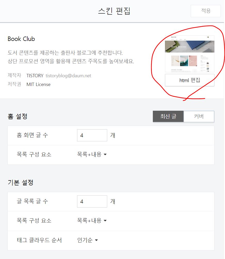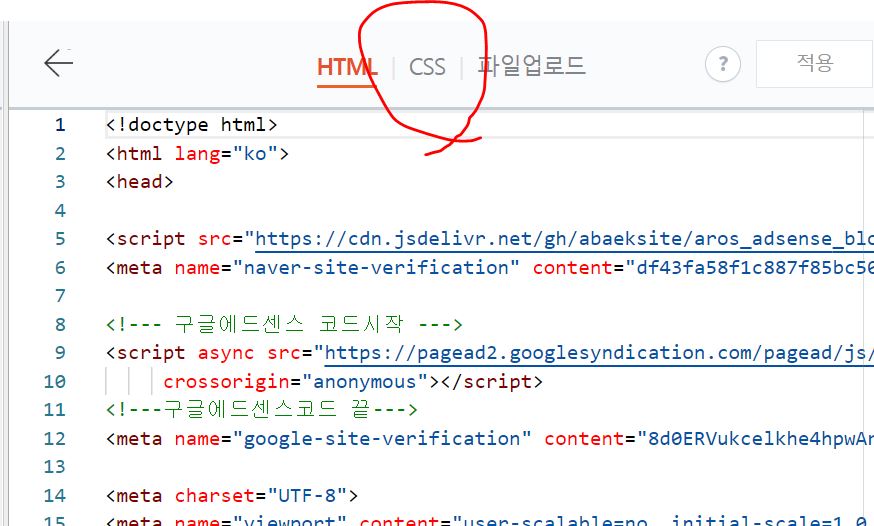 아까 복사한 HTML 코드를 제일 하단에 붙여넣기 하신 후 적용을 누르세요.